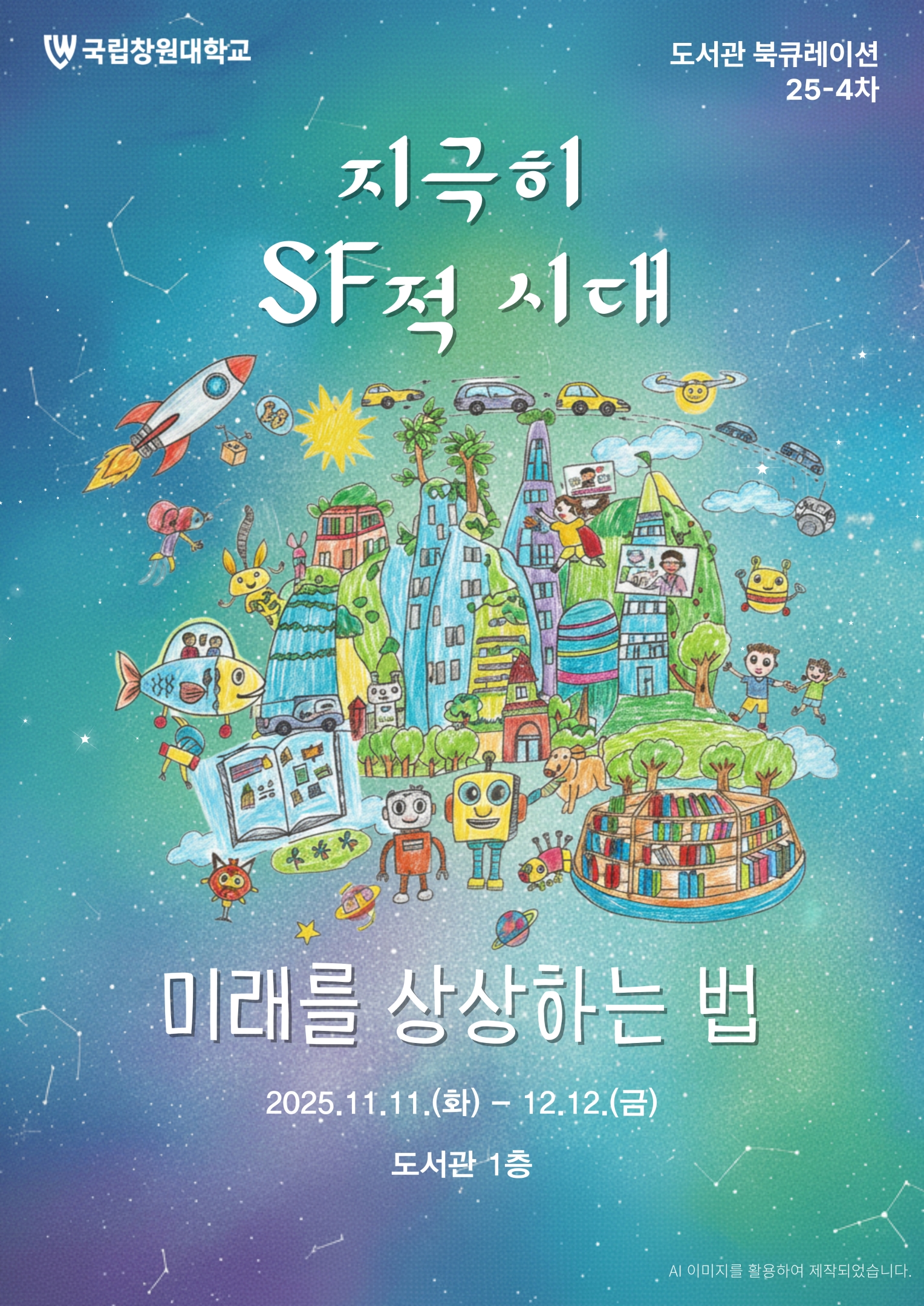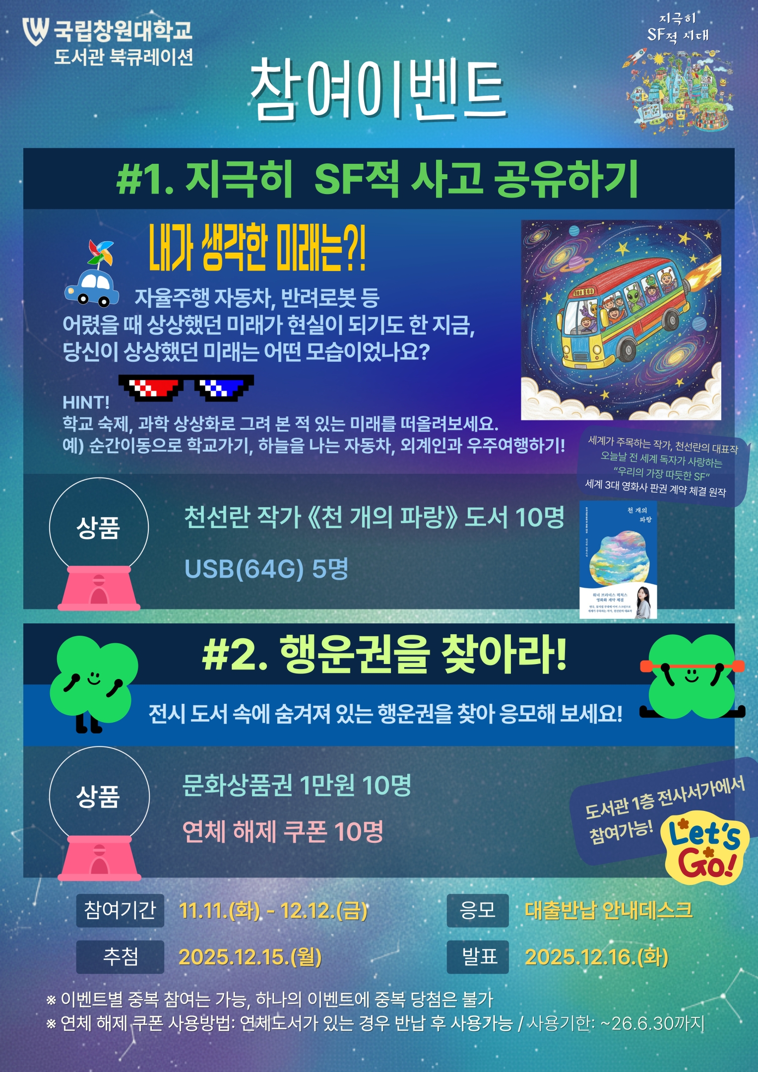 ● 전시주제: 《지극히 SF적 시대, 미래를 상상하는 법》 ● 기간: 2025.11.11.(화) ~ 12.12.(금) ● 장소: 국립창원대학교 도서관 1층 로비 및 자료동 입구 ● 참여이벤트 #1. 지극히 SF적 사고 공유하기! - 🎁 천선란 작가 도서 '천 개의 파랑' 10명, USB(64G) 5명 #2. 행운권을 찾아라! - 🎁 문화상품권 1만원 10명, 연체 해제 쿠폰 10명
